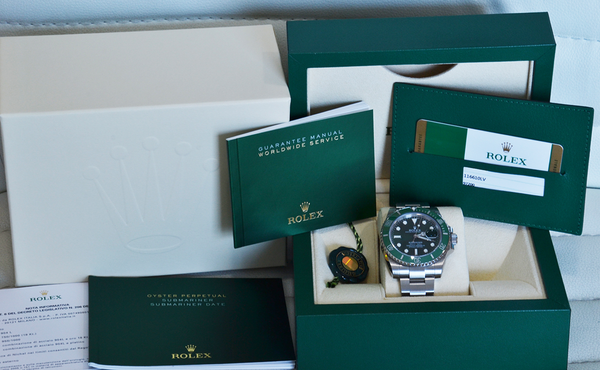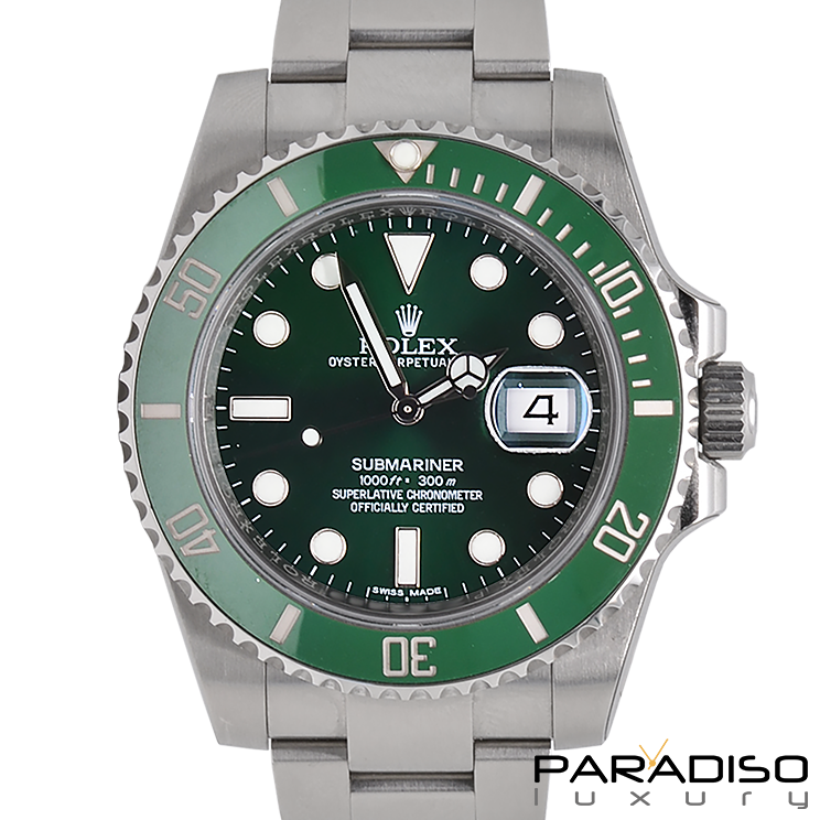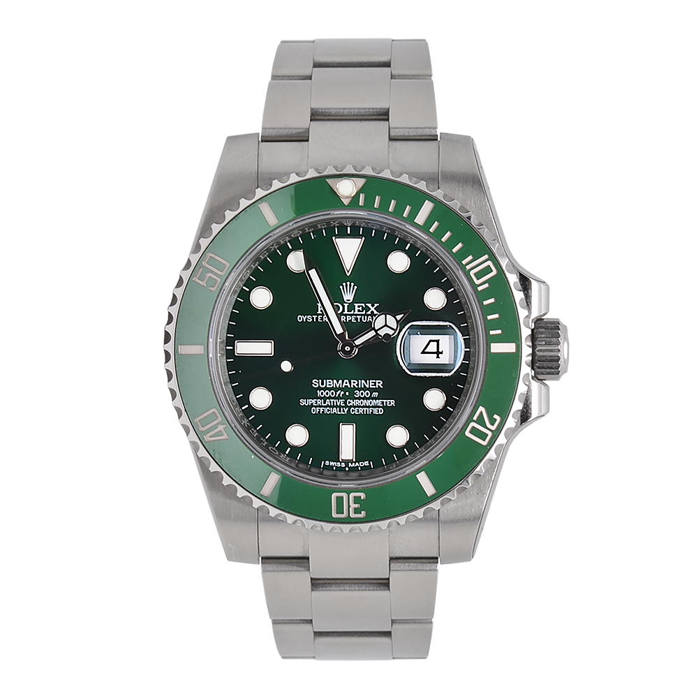 Il Rolex Submariner ref. 116610LV deve il suo soprannome "Hulk" al quadrante verde ed alla ghiera in lega Cerachrom verde. L´Oyster Perpetual Submariner è l´orologio subacqueo per eccellenza e un riferimento assoluto nel suo genere. Presentato nel 1953, agli albori degli sport subacquei, fu il primo orologio impermeabile fino a 100 metri di profondità . Questo storico segnatempo è stato ulteriormente perfezionato grazie a una serie di innovazioni tecniche brevettate da Rolex, garantendogli così affidabilità e precisione fino a 300 metri di profondità . Abituato ai fondali marini, universo nel quale rimane uno strumento indispensabile, il Submariner ha conquistato anche la terra ferma, imponendosi come lorologio dazione per eccellenza, un esempio di robustezza ed eleganza.